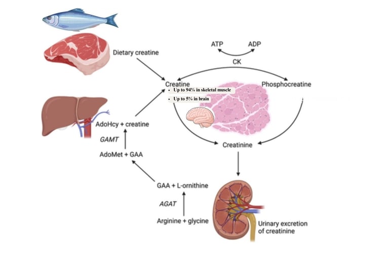 Although only a small fraction of total creatine is stored in the brain, it plays a key role in neuronal energy buffering.